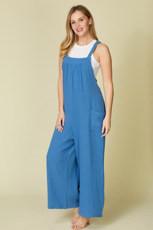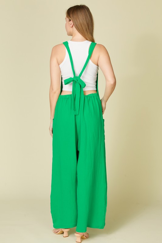 Soft Cotton jumpsuit with pockets and tie adjustable straps. Available in S-XL. $28