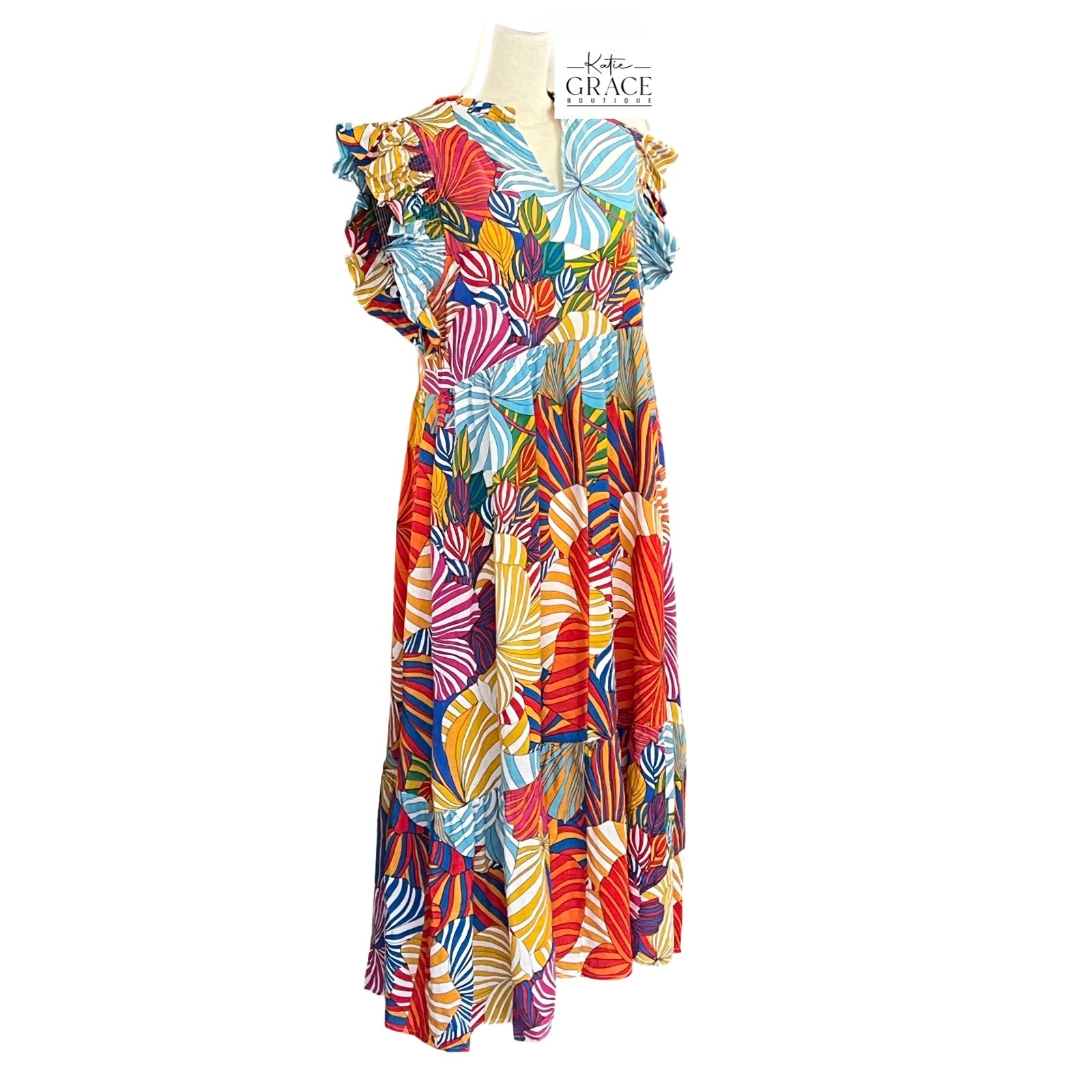 Ruffle sleeve midi dress. Lined with pockets. Available in S-L. $54