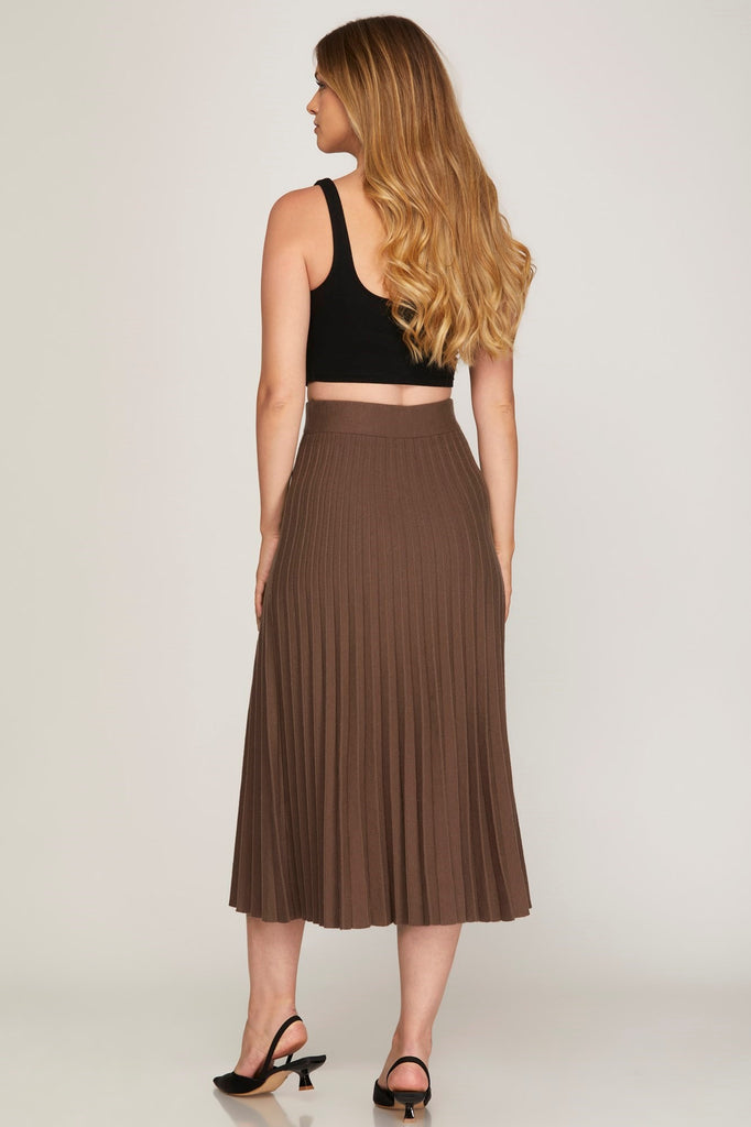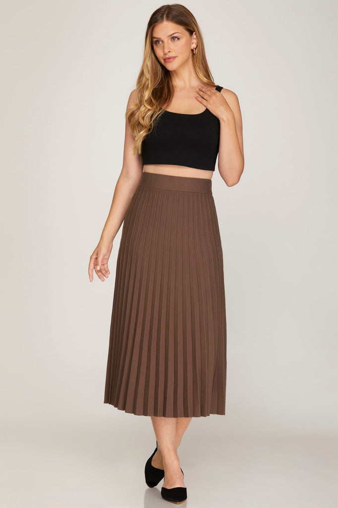 Elastic waist midi pleated skirt. Soft sweater knit. Available in S-L. Black, Brown and Mocha $39