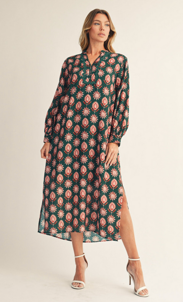 Long sleeves boho floral midi dress with side slit, side pockets, ric rac trim detail. Lined with pockets. Available in S-L. $52