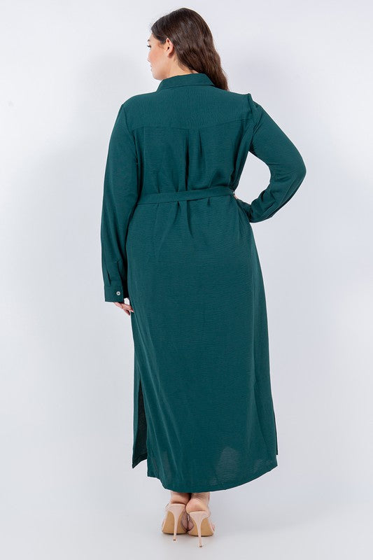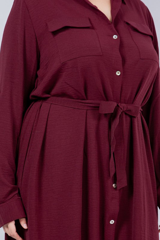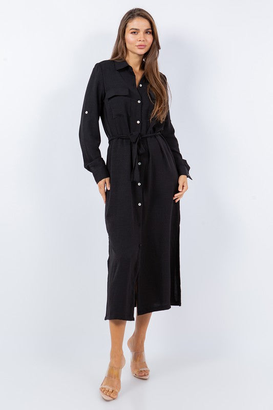 Long sleeve button down dress with a waist tie. Sleeves can be worn long or 3/4 length. Available in S-3XL. $42/$44