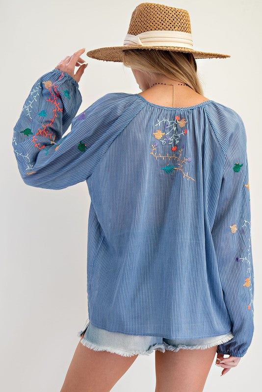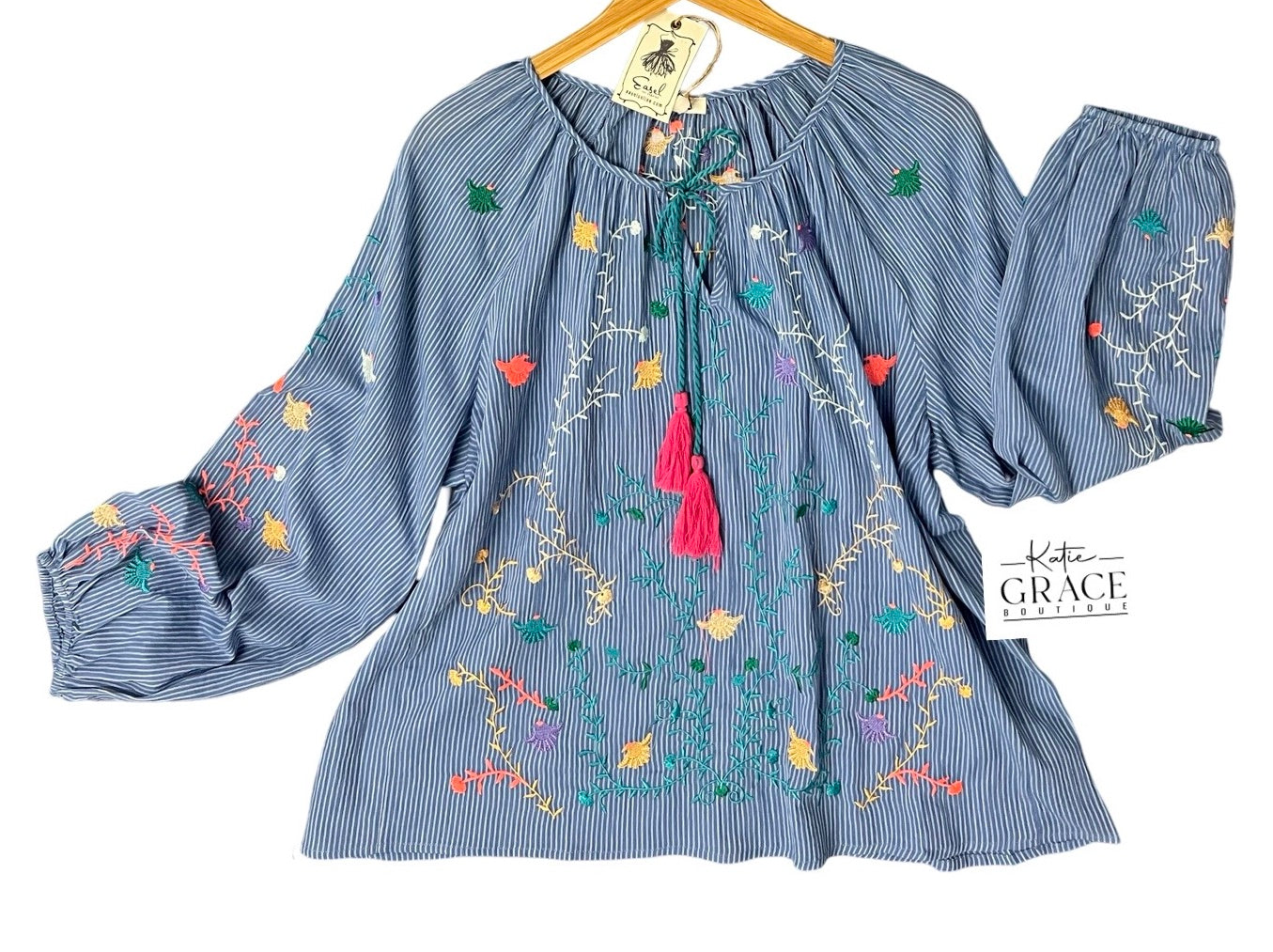 Lightweight , pinstriped embroidered blouse. Available in S-L. $44