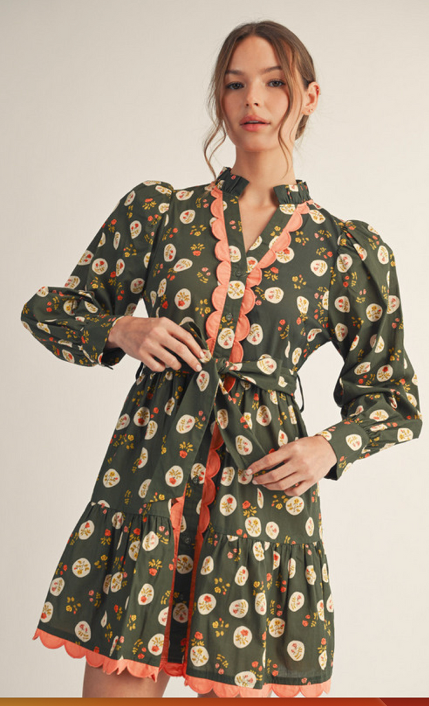 Long sleeves button down tiered floral dress with side pockets, waist tie, ruffled neckline, solid contrast scallop edge detail. S-L. $65