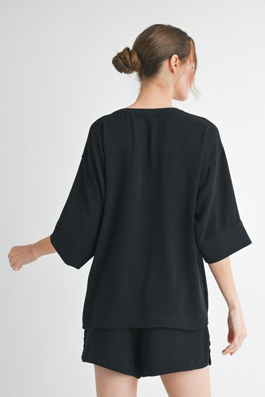 Choose from a 3/4 sleeve blouse with shorts with pockets. Top $32, Shorts $18.