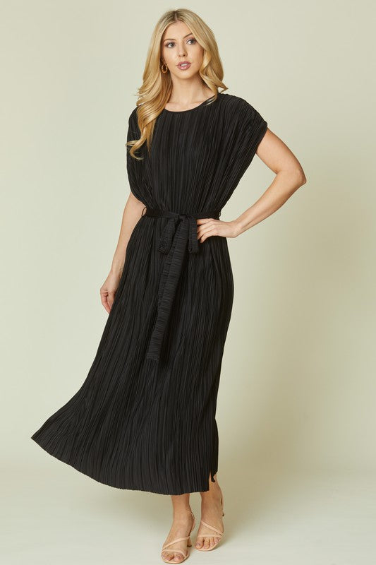 Dolman short sleeve midi dress. Plisse fabric, with a double waist tie. Available in S-XL. $39