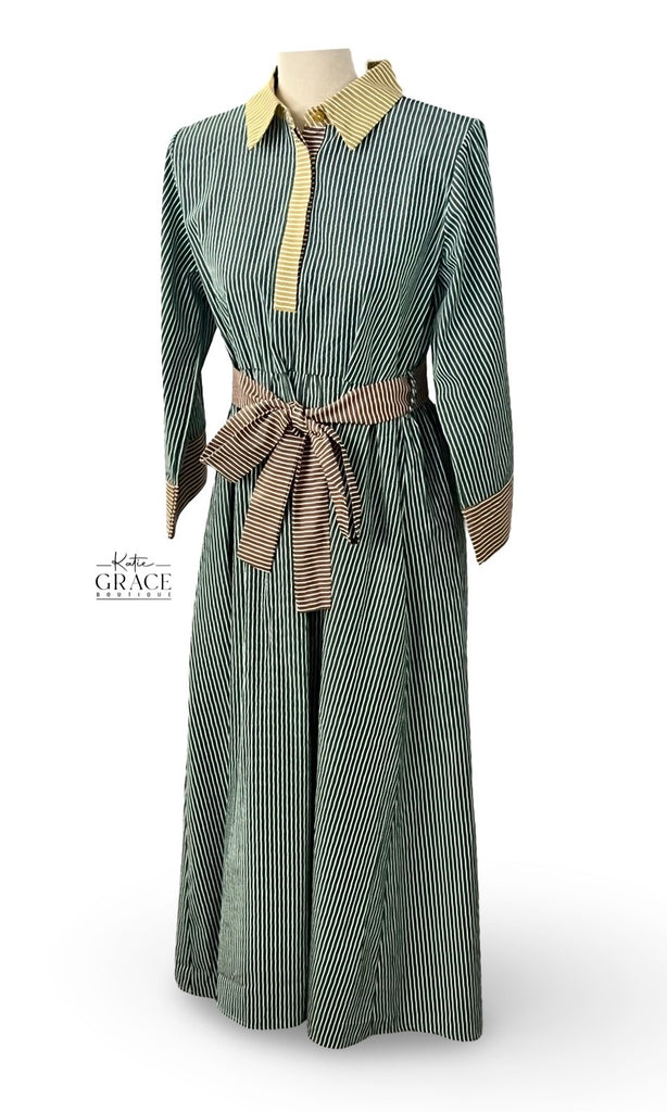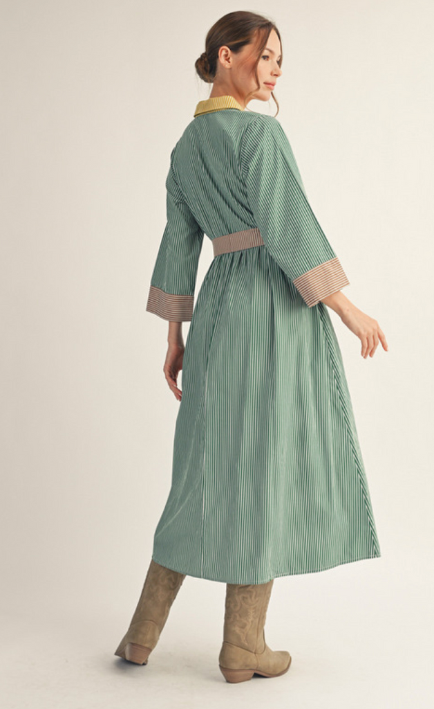 3/4 sleeves stripe fabric mix midi dress with side pockets, front button up, multi color stripe fabric mix match, collared neckline, waist tie detail. S-L. $54
