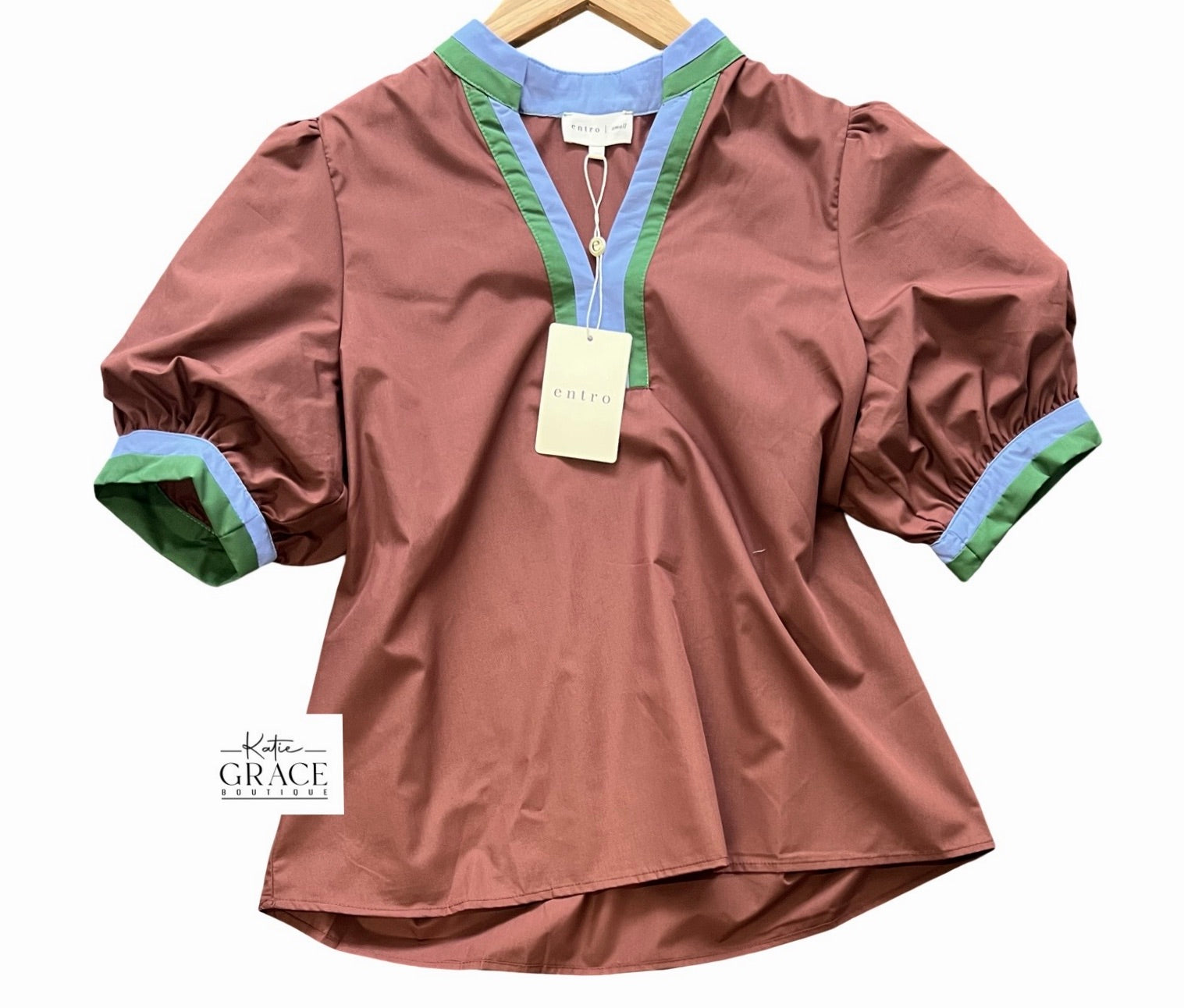 Puff sleeve shirt with contrasting colors. Available in S-L. $38