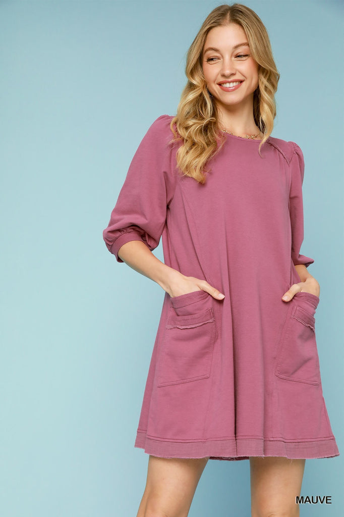 French Terry dress with pockets and a frayed hem. Available in S-L. $38