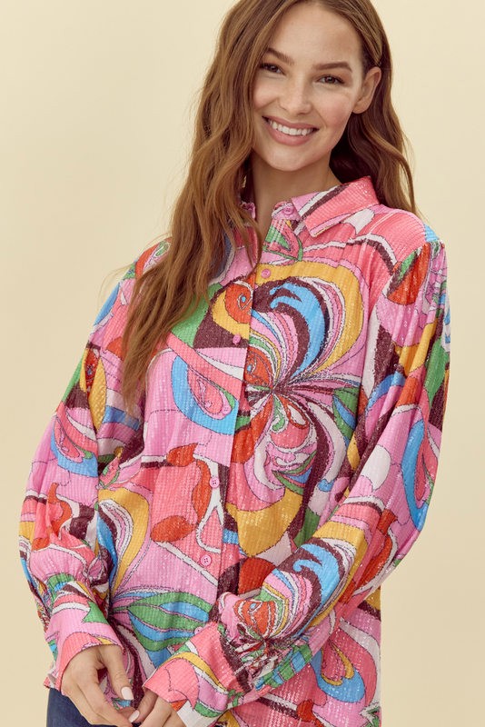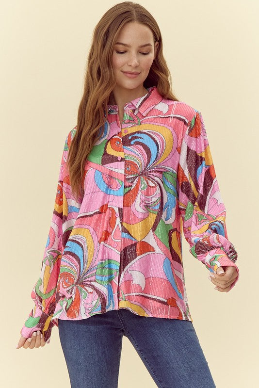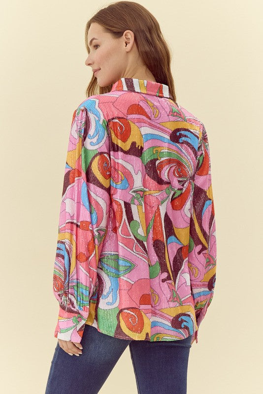 Long sleeve, sequined blouse. Lined. Available in S-XL. $42