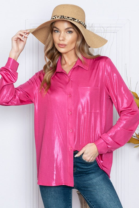 Long sleeve, button down blouse subtle metallic sheen. Stretchy material. Available in S-3XL. $34/$36